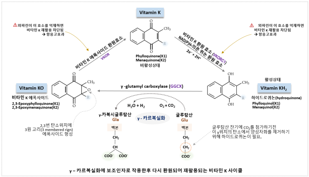 비타민 K와 감마-카르복실화(γ-carboxylation)뼈 형성과 비타민 K는 생화학적으로 매우 밀접한 관련이 있다. 이를 이해하려면 먼저 Gla 단백질(Gla protein)과 γ-카르복실화(γ-carboxylation)라는 핵심 개념을 먼저 짚고 넘어가야 한다. Gla 단백질은 아주 간단하게 말해 칼슘이온(Ca²⁺)과 결합하는 것이 목적인 특수 단백질이고, 이들이 칼슘과 효과적으로 결합하기 위해 거치는 특별한 화학적 수정 절차가 바로 γ-카르복실화(carboxylation)이다. 그리고 그 과정에는 비타민 K가 보조인자로 반드시 필요하다. Gla 단백질로 변형시키는 γ-카르복실화는 뼈 형성뿐아니라, 혈액 응고, 혈관 석회화 조절 등 다양한 생리적 과정에 관여한다. 항혈액응고제 와파린 약물의 기전도 ..