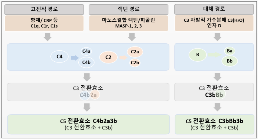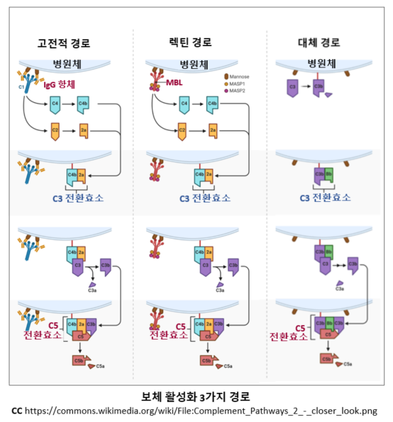 엄격한 보체 규제 및 억제숙주를 손상시킬 가능성이 조금이라도 있다면 그 어떤 생물학적 시스템도 반드시 엄격하게 규제되어야 한다. 자발적으로 시작되는 대체 경로에서 보았듯이 강력한 양성 피드백 loop로 엄청난 양의 보체가 증폭되어 활성화될 수 있다는 점을 감안해 보자면 보체 역시 신중하게 통제되어야 할 시스템임이 분명하다. 보체의 활성화는 병원체 표면에서만 일어나도록 국한되어야 하고, 그 대상 역시 병원체나 또는 제거되고 청소될 필요가 있는 손상된 숙주세포로만 제한되어야 한다. 또한, 보체 체계는 알레르기성 쇼크와 유사한 아나필락시스 상황을 초래할 수도 있는 염증성 아나필락시스 독소(Anaphylatoxin)를 그 활성화 과정에서 만들어 내기 때문에, 보체가 면역 활동을 수행하는 과정에서 정상적인 숙주..